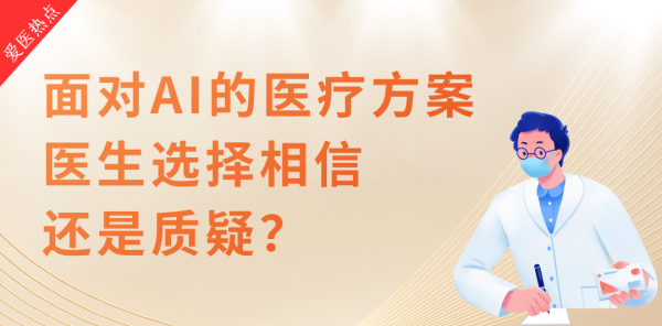 爱医热点:面对AI的医疗方案,医生会选择相信还是质疑? 在医疗科技飞速发展的当下,AI正逐步渗透至医疗领域的各个环节,从疾病诊断到治疗方案制定,AI愈发频繁地出现在医生的诊疗过程中。如今,AI能秒级分析影像、推荐用药、预测并发症,甚至生成完整病历。面对这些输出,有的医生将其视为高效助手,快速核对后采纳;有的则保持距离,仅作参考,坚持“最终判断必须出自人手