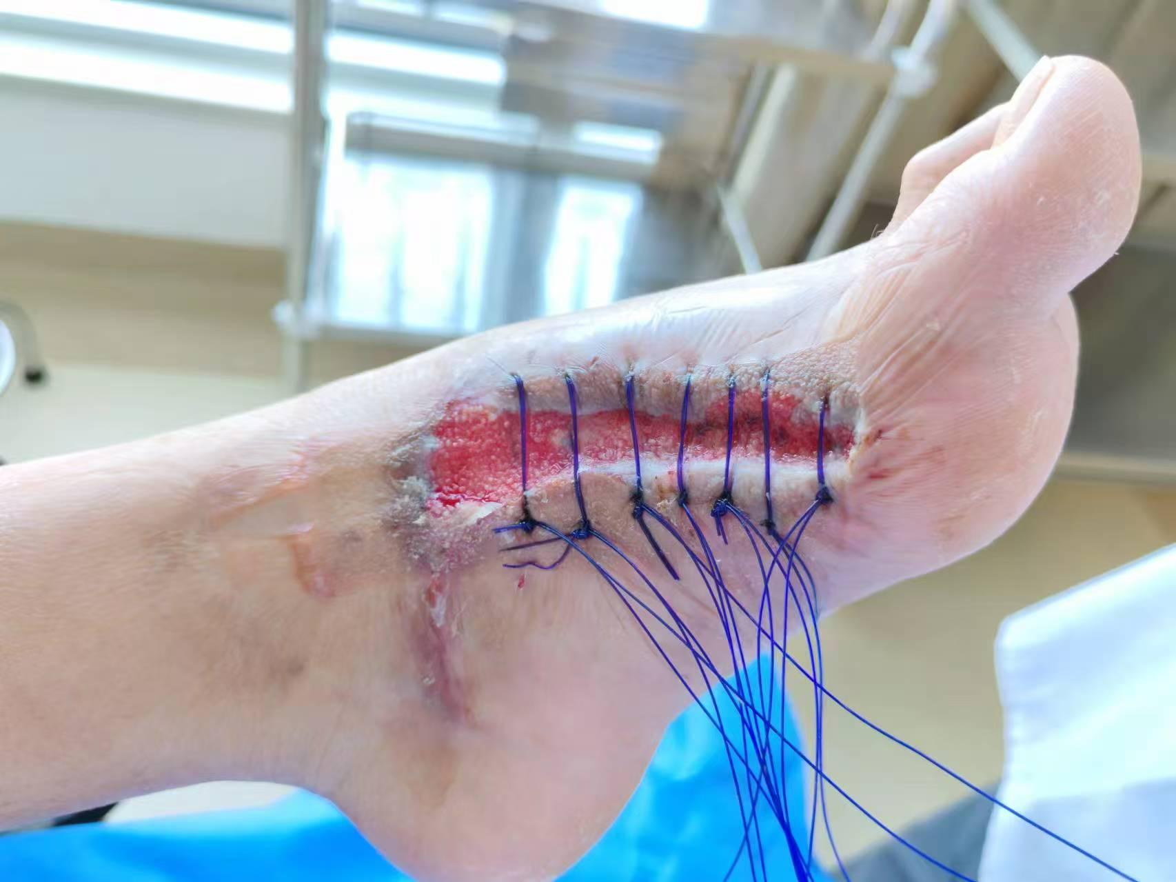 二、足部内侧有相对较大的弧面,并非平坦的创面,在牵张中也容易出现缝线切割。